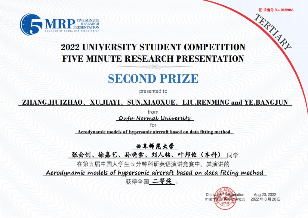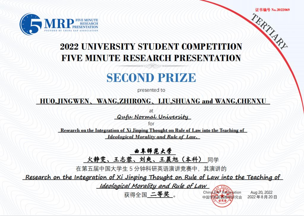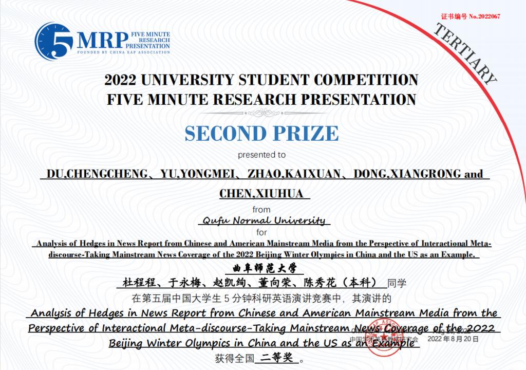 附2:第五届中国大学生五分钟科研英语演讲大赛米兰官方网站获奖团队获奖证书