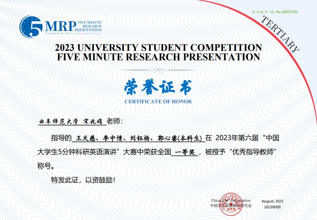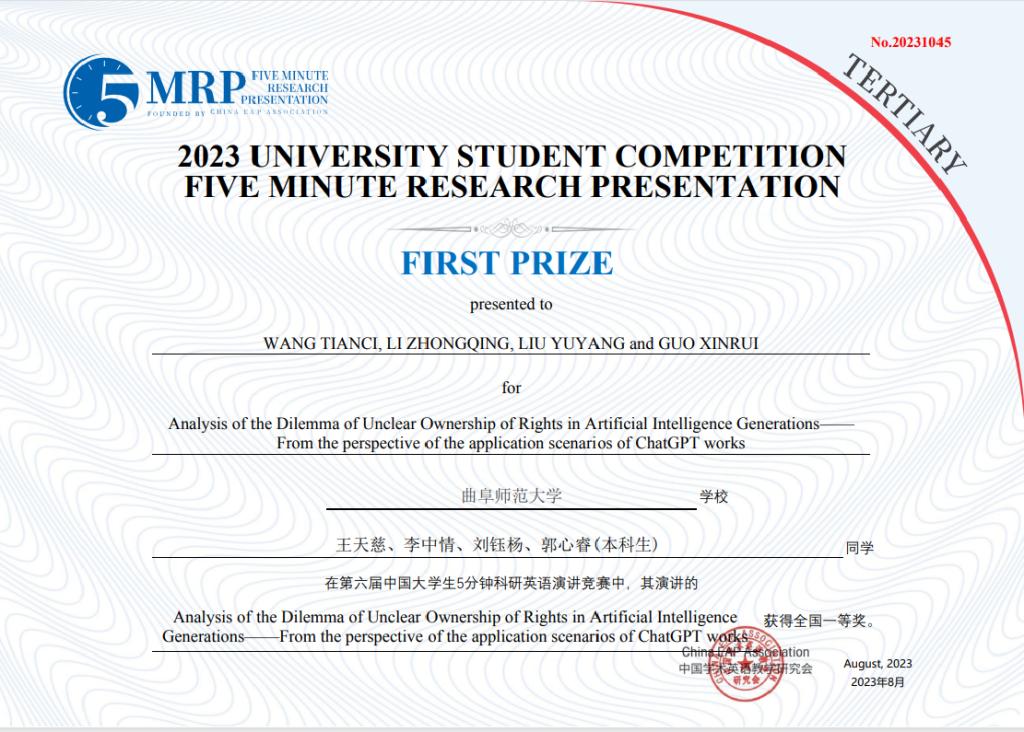日前,第六届中国大学生5分钟科研英语演讲竞赛决赛(非医科类)在同济大学成功举行。由米兰官方网站选拔推荐的16支团队取得优异成绩,获得全国一等奖1项、二等奖6项、三等奖9项。其中,由王天慈、李中情、刘钰杨、郭心睿等四位同学组成的团队作品“Analysis of the Dilemma of Unclear Ownership of Rights in Artificial Intelligence Generations — From the perspective of the application scenarios of ChatGPT works”荣获全国一等奖。此外,其他16支参赛队伍分获校级一、二、三等奖。宋兆娟、李梦实等25位老师荣获优秀指导教师奖。