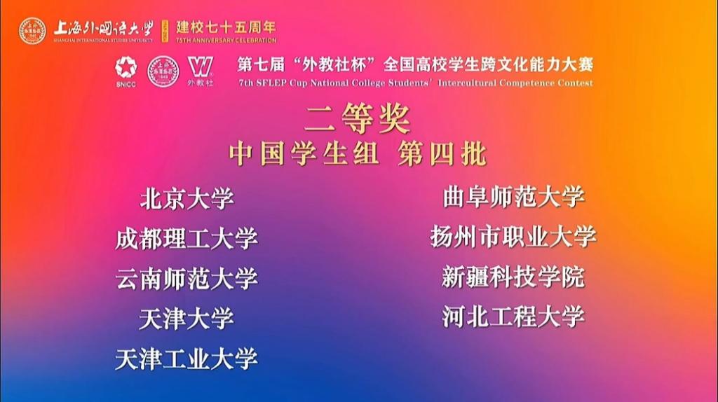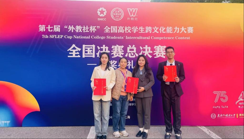 11月28日-12月1日,第七届“外教社杯”全国高校学生跨文化能力大赛在上海外国语大学成功举办。由巩奕含(统计与数据科学学院)、崔又心(统计与数据科学学院)、杨浩然(外国语学院)组成的米兰官方网站代表队荣获全国二等奖,公共外语教学部副教授仲蕾荣获优秀指导教师奖,这是米兰官方网站在该项赛事中首次荣获国家级奖项,取得历史性突破。