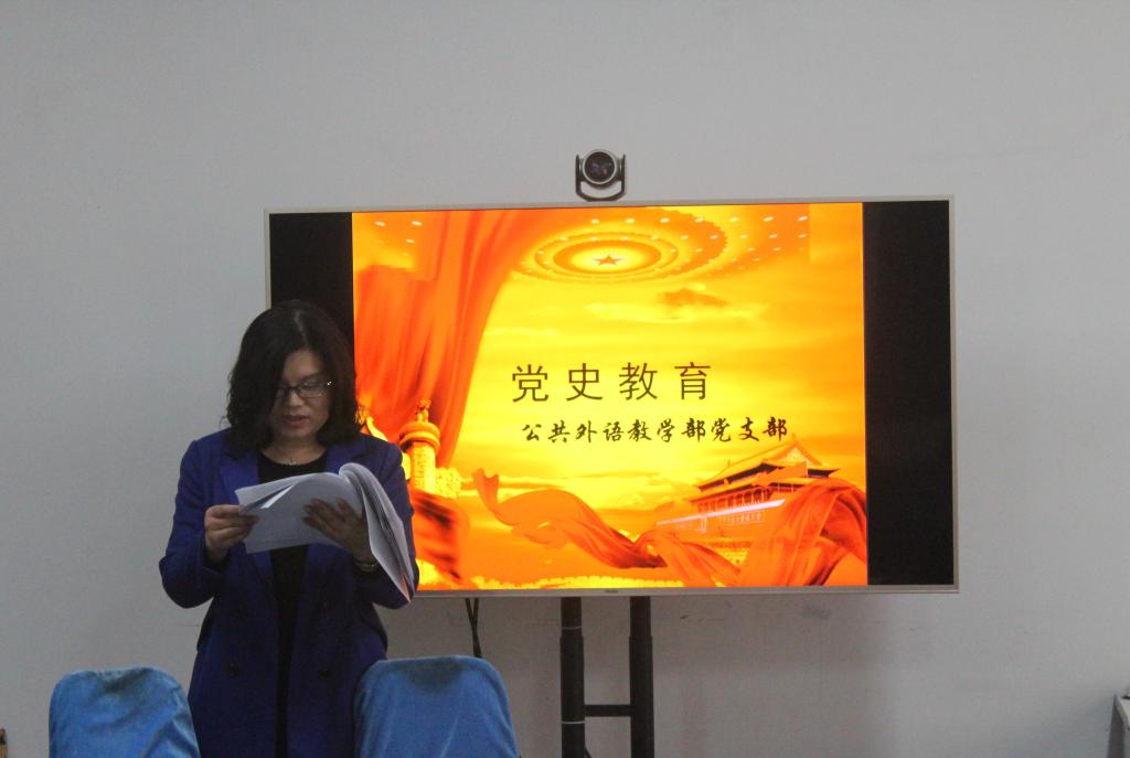 为深入学习贯彻习近平总书记在党史学习教育动员大会上的重要讲话精神,扎实开展党史学习教育,推动广大党员学史立身、以史为镜、知史奋进,4月7日下午,公共外语教学部米兰官方网站党支部在本部一楼党员活动室开展“党史学习教育”主题党日活动。全体党员参加,支部副书记刘成干主持活动。