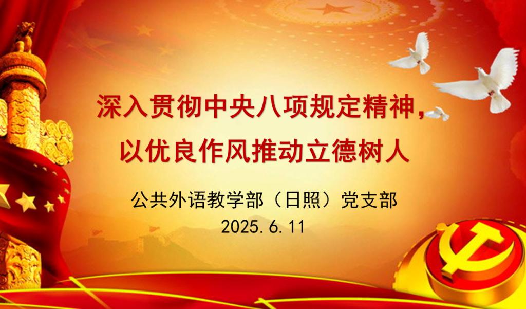 为深入贯彻党中央的八项规定精神,提升党员们的纪律和规矩意识,正风肃纪,公共外语教学部(日照)党支部于6月11日下午在JC1002会议室开展支部书记讲党课活动。活动由支部书记杜庆凤主持,全体党员参加。