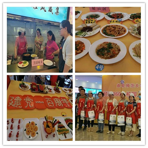 教职工组烹饪比赛分为指定菜品和自创菜品比赛两个环节。活动现场紧张而有序,参赛教职工按照比赛规则在规定的时间内同台竞技,展示精湛的厨艺。在比赛中,汪娟老师在亲友团的鼓舞和帮助下,从容备料、热油、翻炒、调味,一系列“神”操作,瞬间整个现场菜香扑鼻, “麻婆豆腐”、“酸辣土豆丝”两道精致菜肴炒制出炉并摆上展台,菜品鲜亮诱人;自创菜品环节,汪娟老师使用青椒、红椒、胡萝卜、肉片做出了色香味俱全的“春色满园”,菜品体现了曲园特色。评委们分别从菜品色泽、外观、口感、味道、创意与健康营养等方面对选手菜品进行了详细的点评。在比赛间隙,孔府菜的非遗传承人还准备了精彩的萝卜雕花表演。