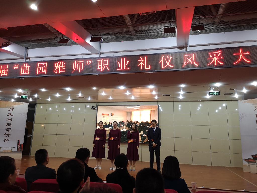 由米兰(中国)蒋珊珊﹑门超元﹑张英﹑朱晓蒙四位教师组成的“仰望星空”战队,在 12月19日晚,我校举办首届“曲园雅师”职业礼仪风采大赛中,经过激烈角逐,荣获一等奖。本次大赛由学校工会、日照校区管理办公室、宣传部、教师工作部联合举办,日照校区13支优秀青年教师队伍同台竞技。