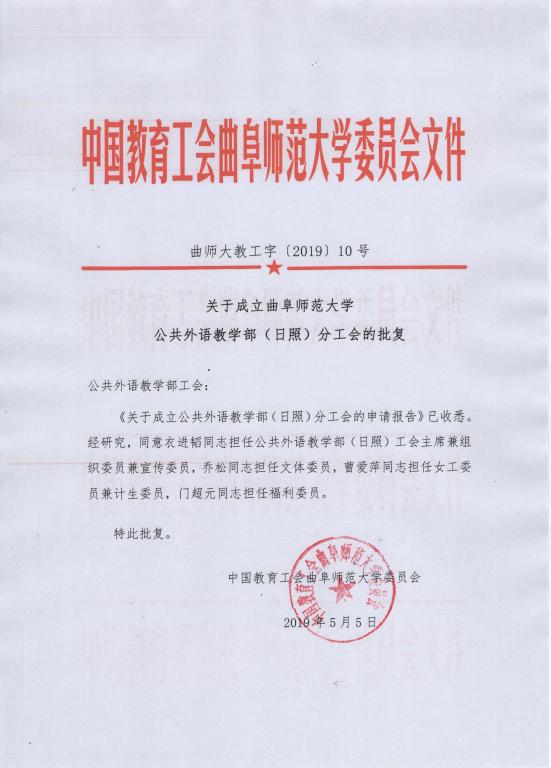 曲师大教工字〔2019〕10号关于成立米兰官方网站公共外语教学部(日照)分工会的批复