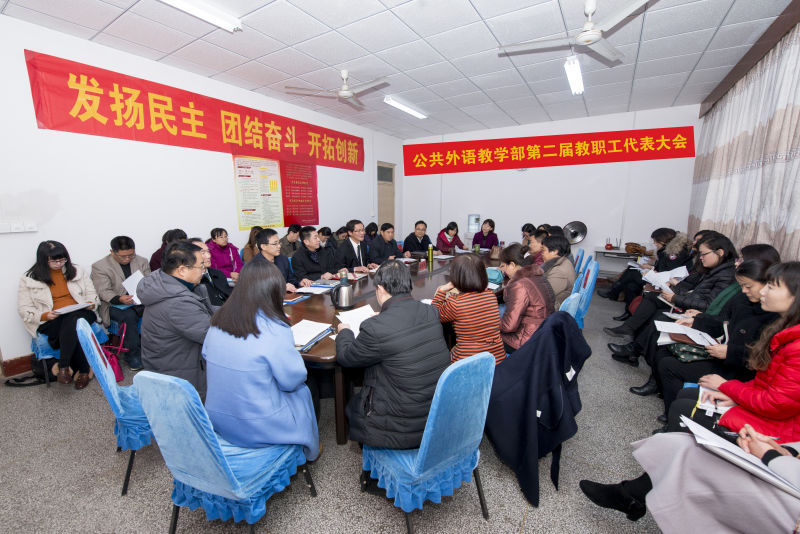 两校区的39名代表于11月25日上午11时准时到达会议现场,参加正式会议。会议首先由校党委常委、副校长夏云杰教授致辞,他在致辞中说召开教代会是公共外语教学部教职工政治生活中的一件大事,是上下学习贯彻党的十九大精神,落实学校“十三五”发展规划,加强基层单位民主政治建设的重要举措。他代表学校党委、校行政向会议的召开表示热烈的祝贺!在热情洋溢的致词中,夏校长也提出开好二级教代会,对于调动广大教职工的积极性、主动性和创造性,参与单位科学管理、民主决策,推动单位民主政治建设,促进各项事业科学发展,具有不可替代的重要作用。 当前,我校正处于加快推进高水平大学建设、“双一流”建设的重要时期,既有难得的发展机遇,又将面临各种严峻的挑战,需要我们进一步强化机遇意识、发展意识,集思广益,认真思考,科学谋划。本次会议将听取主任工作报告,讨论审议外语部建设发展的重大问题,内容重要,涉及到外语部未来的发展,涉及到全体教职工的切身利益。希望大家高度重视,以饱满的政治热情、严肃的工作态度和强烈的主人翁意识,认真履行自己的神圣职责,积极为外语部发展理思路、提建议、出点子,努力把这次会议开成一次凝聚力量、鼓舞人心的大会,一次科学谋划、促进发展的大会。