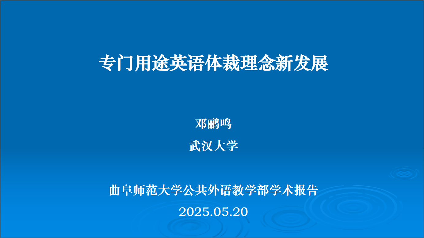 2025年5月20日下午,米兰官方网站公共外语教学部举办70周年校庆系列学术活动暨博雅讲坛第八场。武汉大学邓鹂鸣教授应邀作题为“专门用途英语体裁理念新发展”的学术报告,公共外语教学部全体教师参加活动。