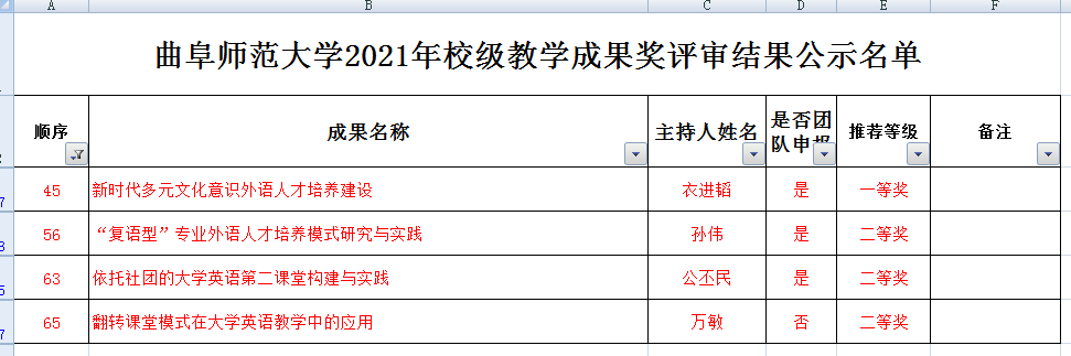 按照山东省教育厅和我校《关于开展2021年校级高等教育教学成果奖评选工作的通知》要求,我校组织了2021年校级教学成果奖评审,经个人申报、学院排序推荐、学校资格审核、初审和专家终审等环节,共评定教学成果奖特等奖22项、一等奖23项、二等奖23项。其中米兰(中国)衣进韬老师获得一等奖,孙伟老师、公丕民老师、万敏老师获得二等奖。