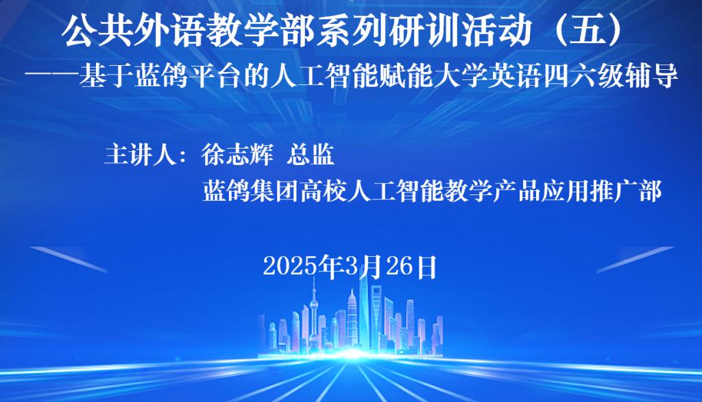 3月26日下午,公共外语教学部举办2024-2025学年春季学期第五场全员研训活动,本次研训以“基于蓝鸽平台的人工智能赋能大学英语四、六级辅导” 为主题,邀请蓝鸽集团有限公司高校人工智能教学产品应用推广部总监徐志辉作专题讲座,进行技术应用辅导,公共外语教学部全体教师参加了本次研训活动。